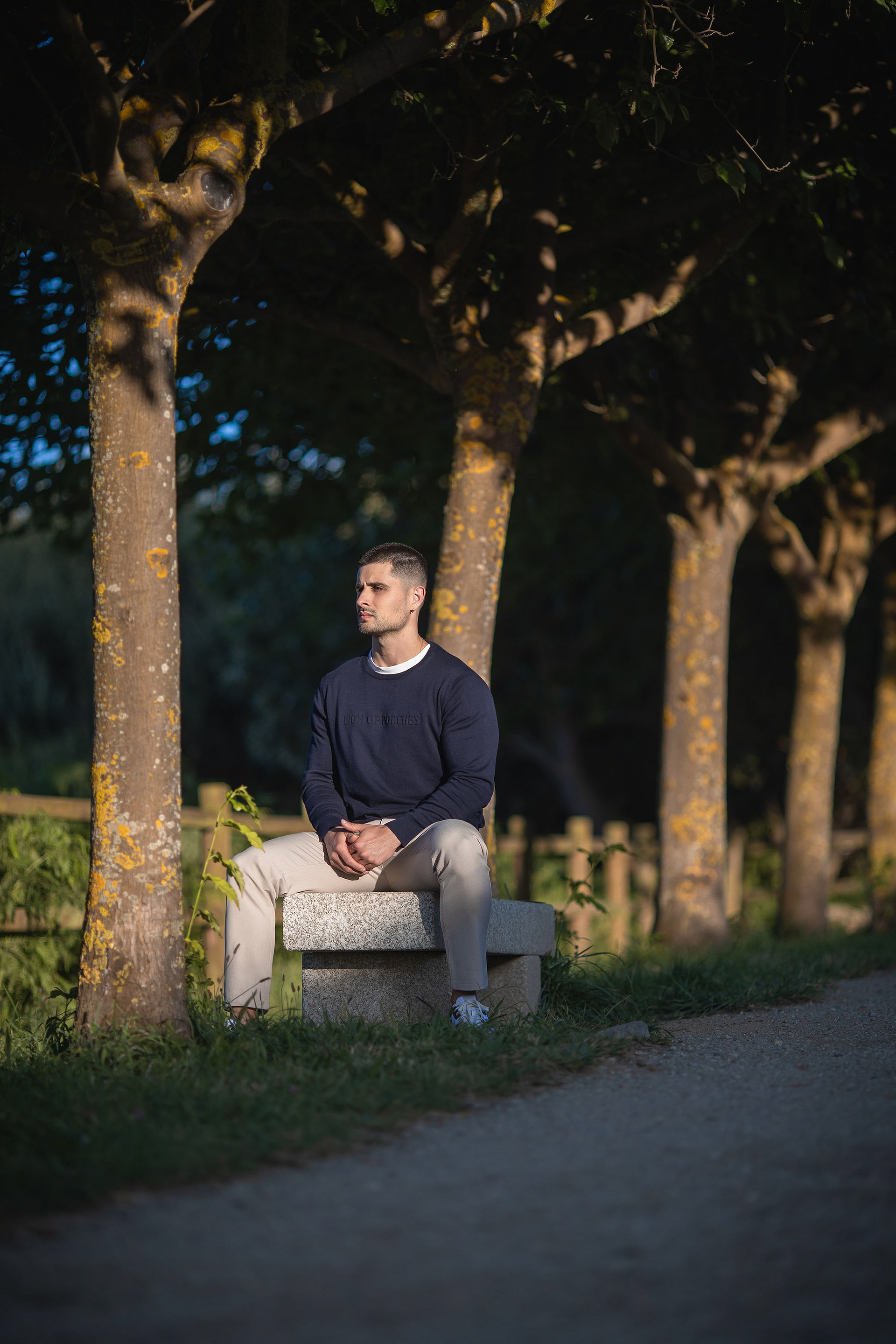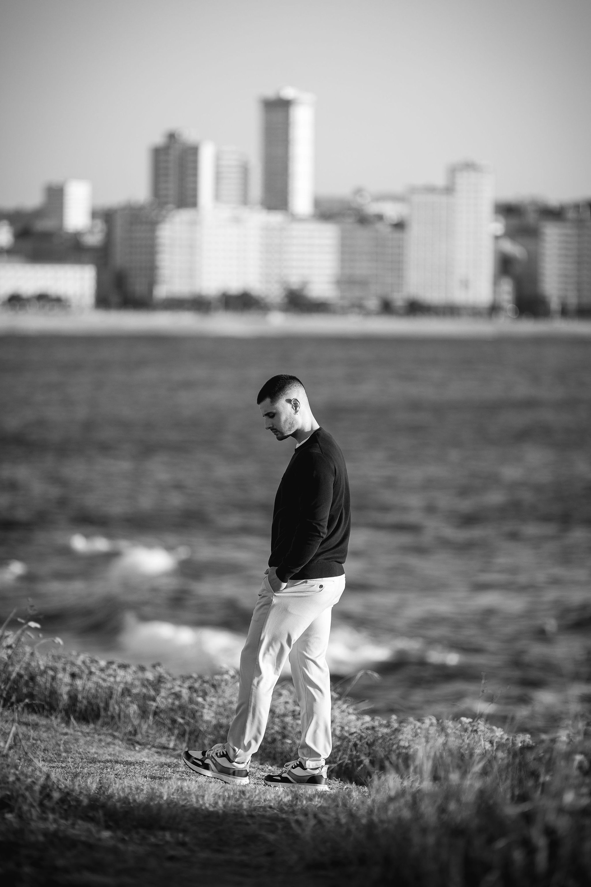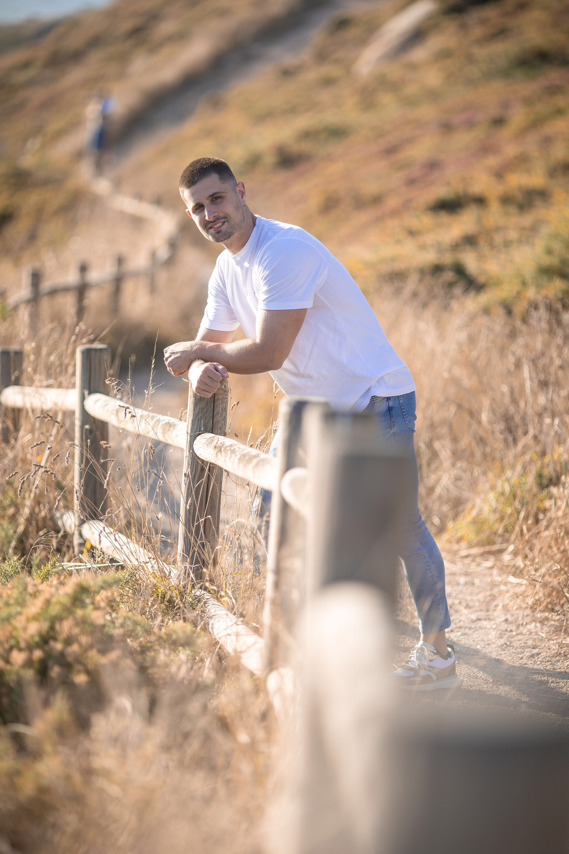 Con Hugo realizamos una sesión al aire libre en los alrededores de la Torre de Hércules, aprovechando la luz cambiante del atardecer coruñés que se desvanece sobre Riazor. La idea era capturar su esencia con naturalidad, dejando que el viento, la textura de la piedra y la luz cálida del final del día marcaran el ritmo de cada retrato.