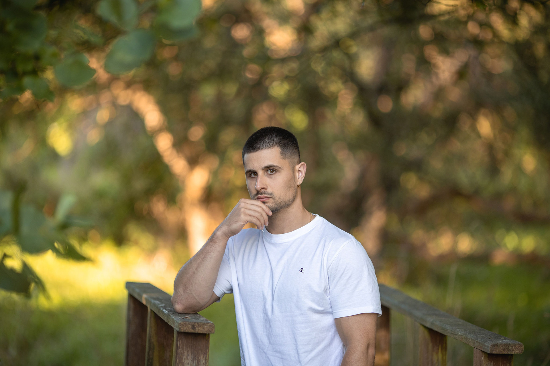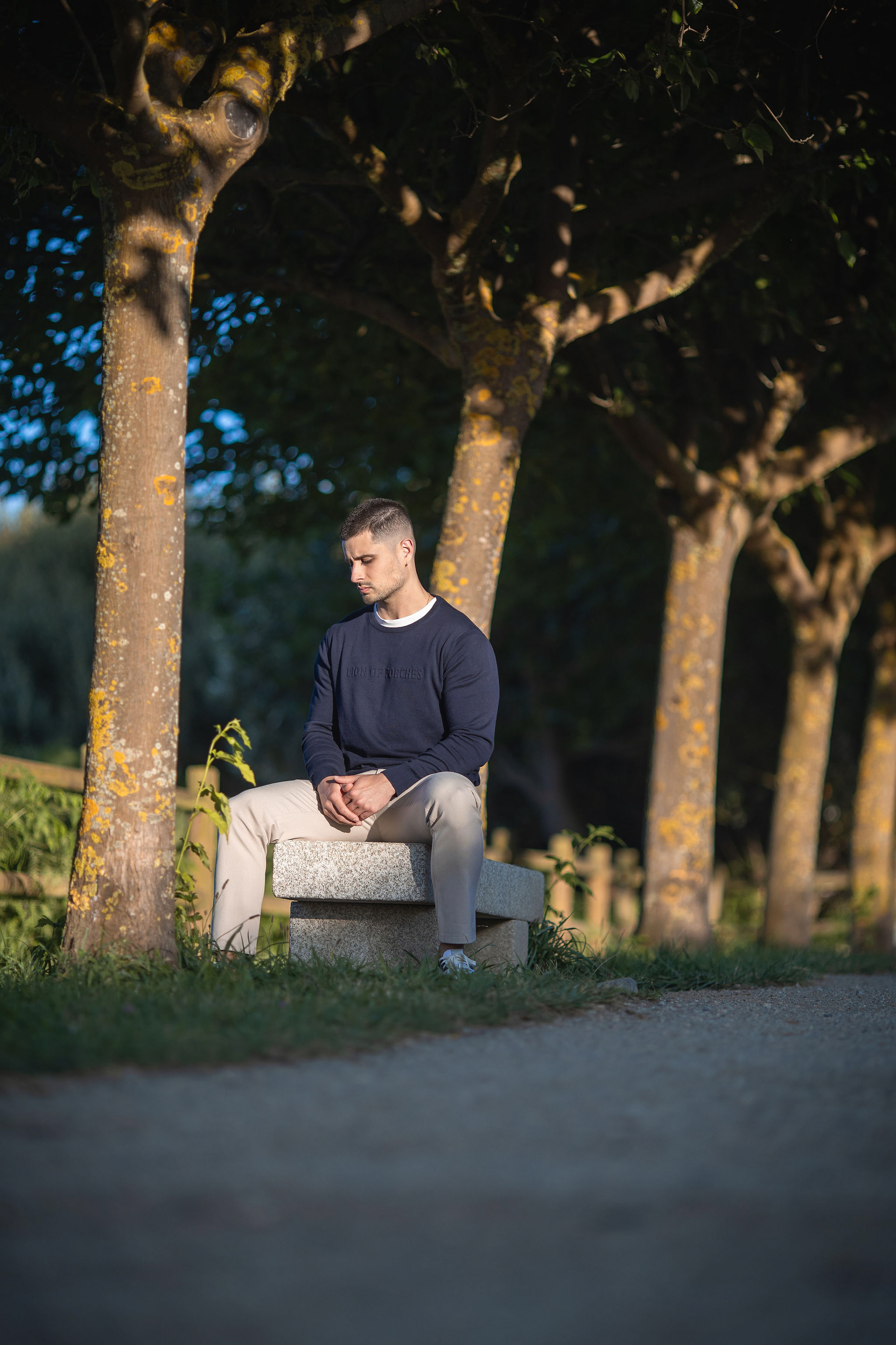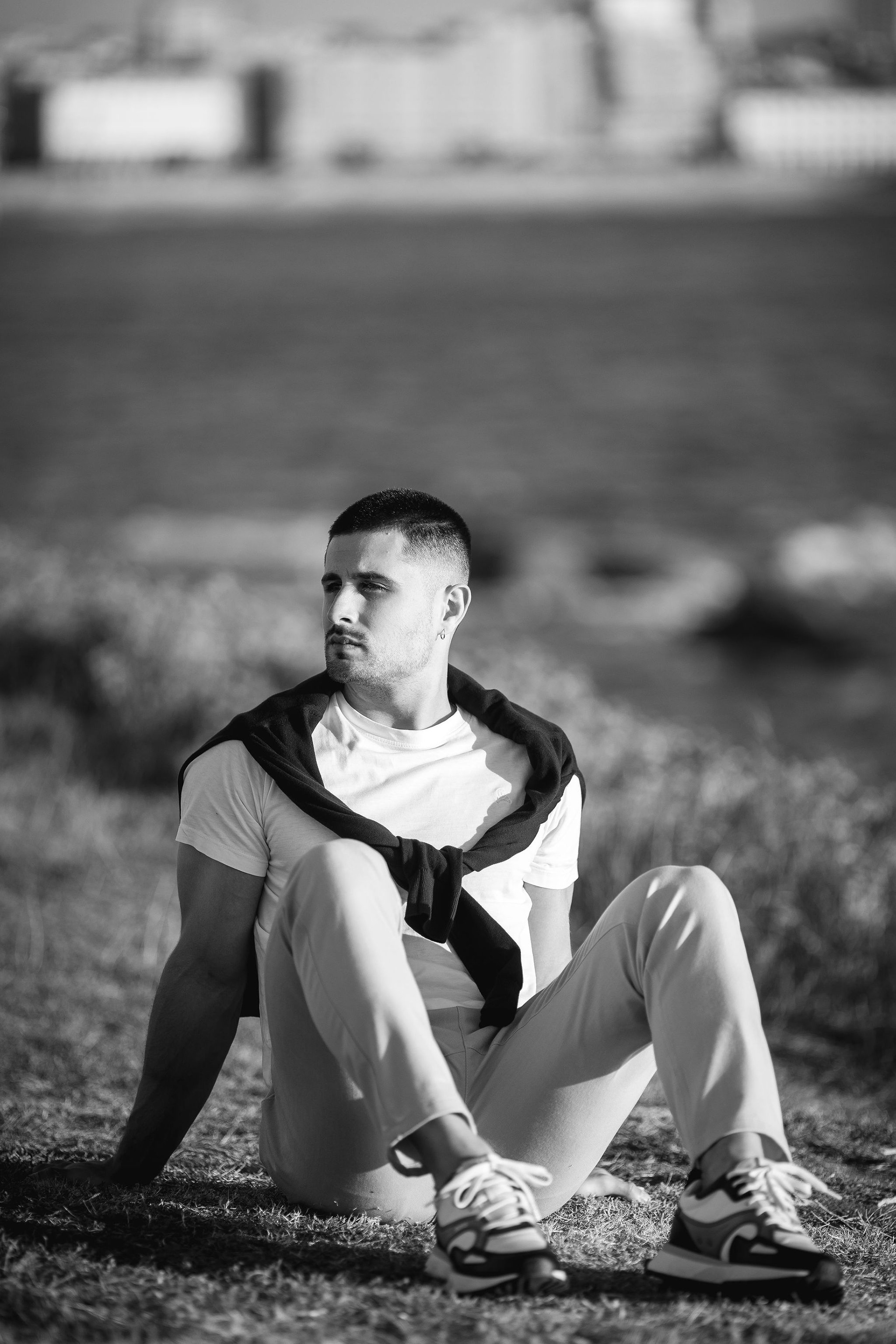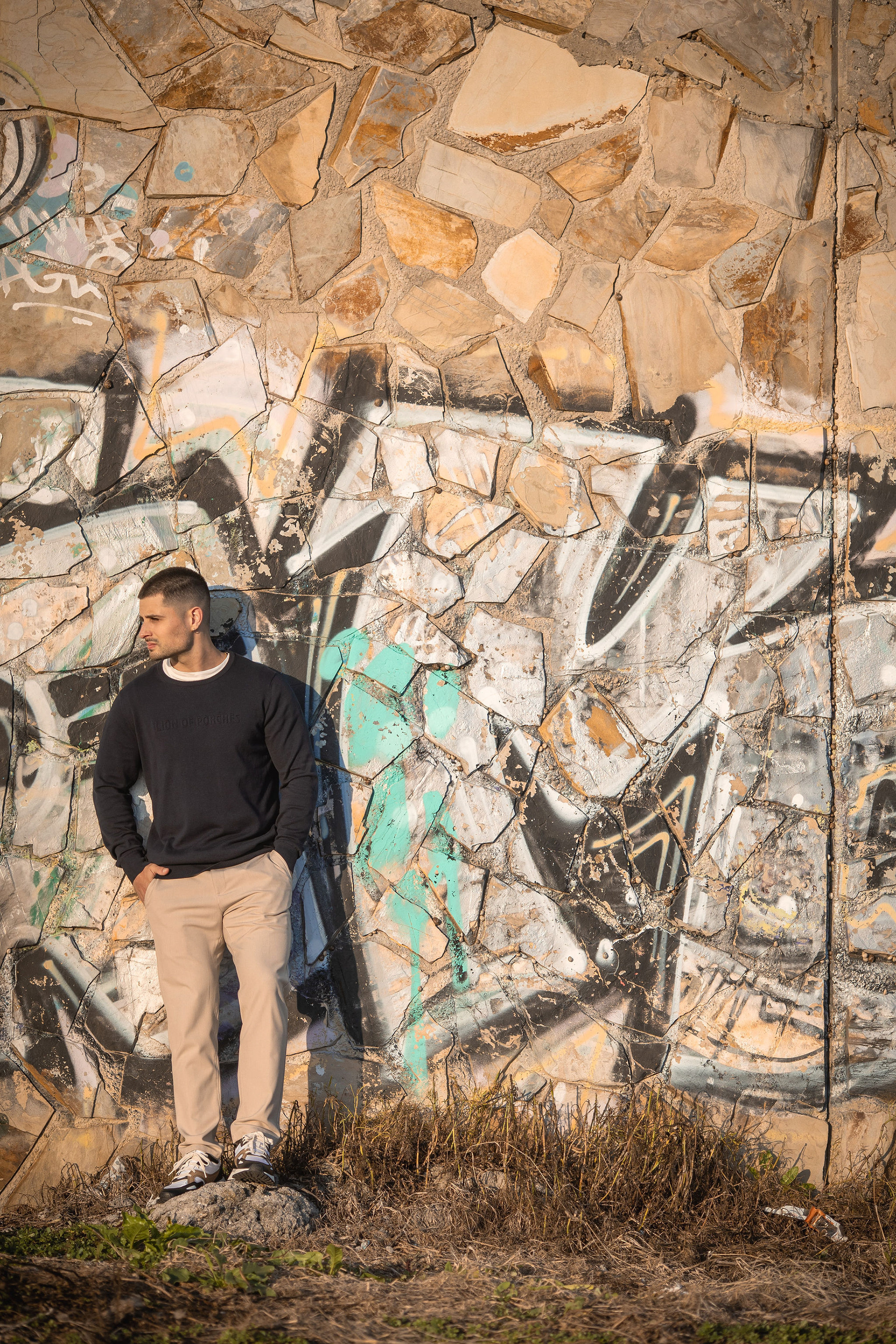 Con Hugo realizamos una sesión al aire libre en los alrededores de la Torre de Hércules, aprovechando la luz cambiante del atardecer coruñés que se desvanece sobre Riazor. La idea era capturar su esencia con naturalidad, dejando que el viento, la textura de la piedra y la luz cálida del final del día marcaran el ritmo de cada retrato.