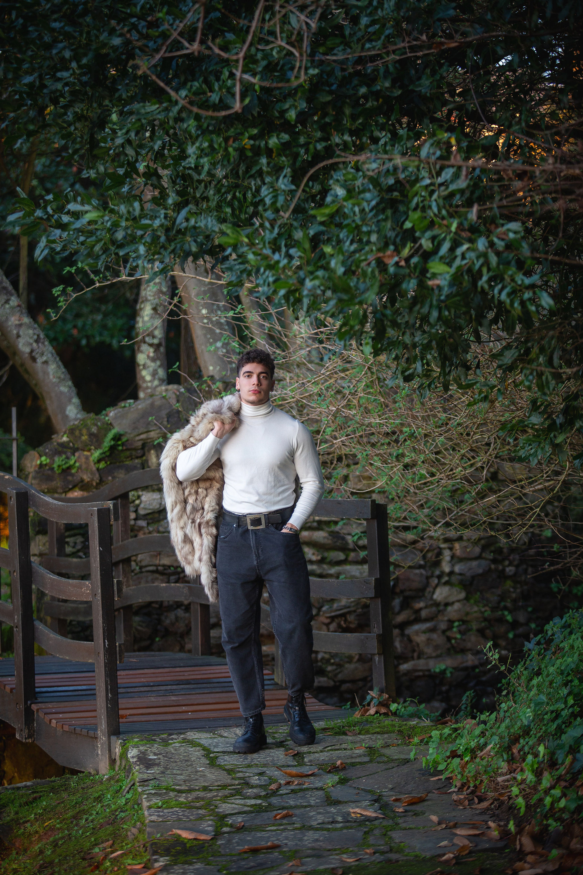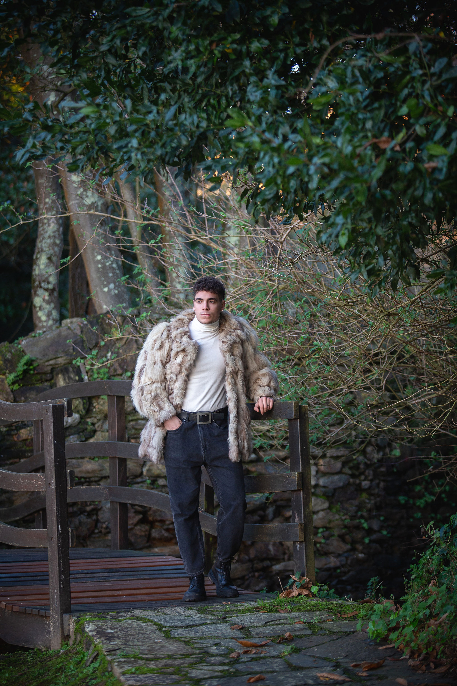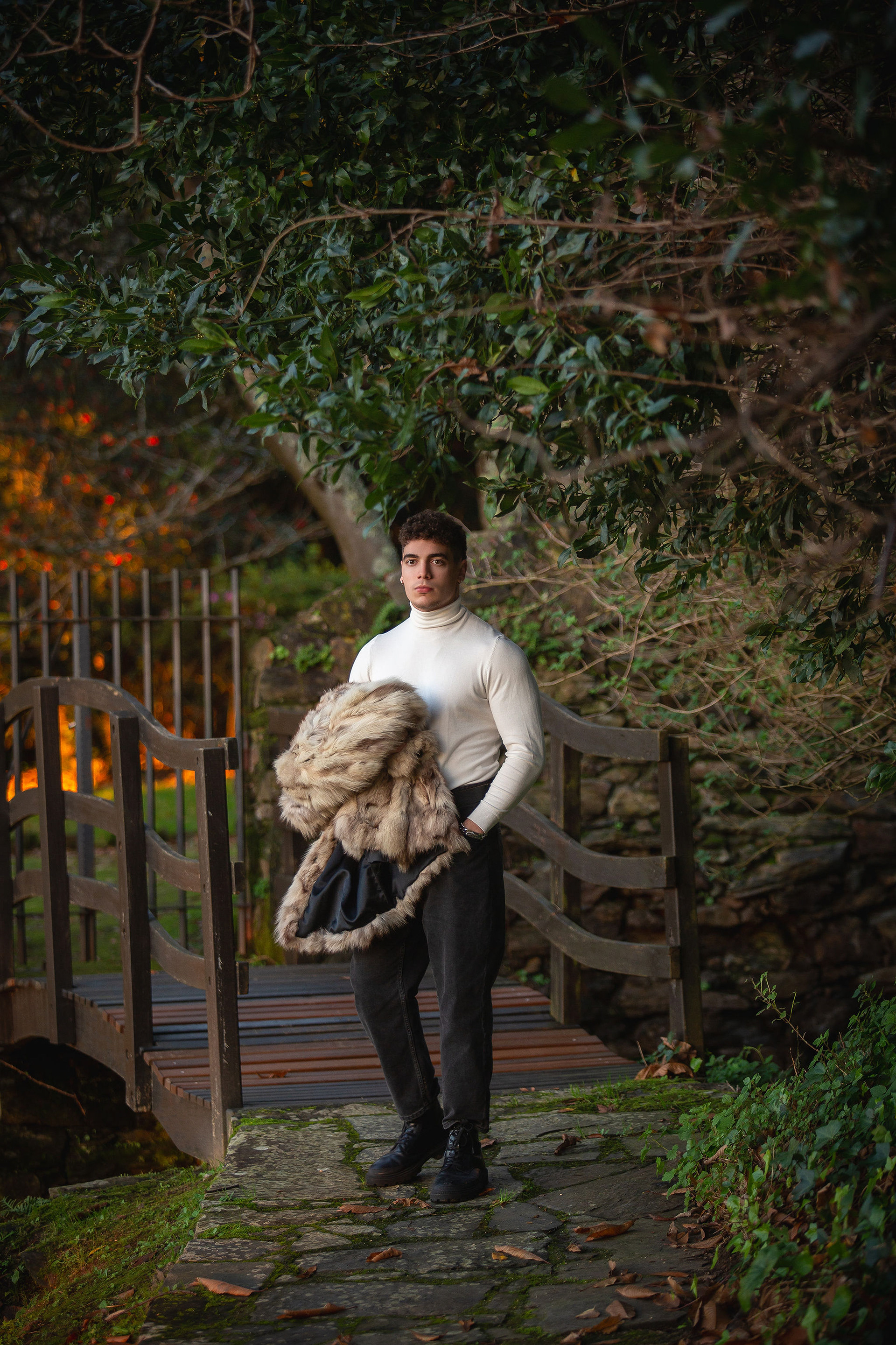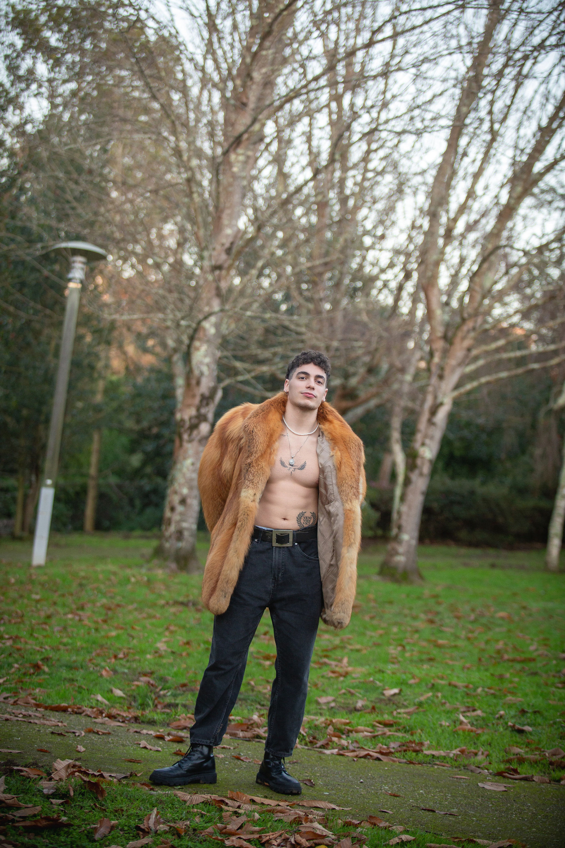 La sesión con Ismael en el parque de Montrove, en Oleiros, fue un homenaje a la paleta dorada y cobriza del otoño. El escenario era un lienzo vivo: una alfombra de hojas crujientes en tonos de ámbar, carmesí y ocre cubría los senderos, mientras la luz tamizada por las ramas de los árboles creaba un ambiente íntimo y mágico. Ismael, con su figura esbelta y juvenil, se movía con una soltura natural, vistiendo una combinación estudiada de clásico y moderno. El icónico abrigo de piel, lanzado con desenfado sobre sus hombros, contrastaba con piezas de corte actual, creando una imagen de una elegancia atemporal que resaltaba su físico sin necesidad de mostrarlo explícitamente.