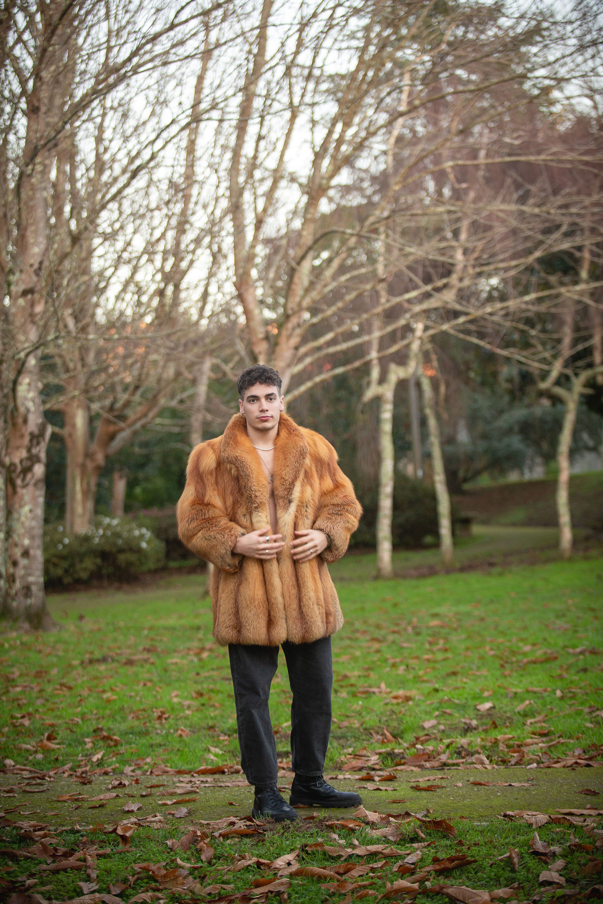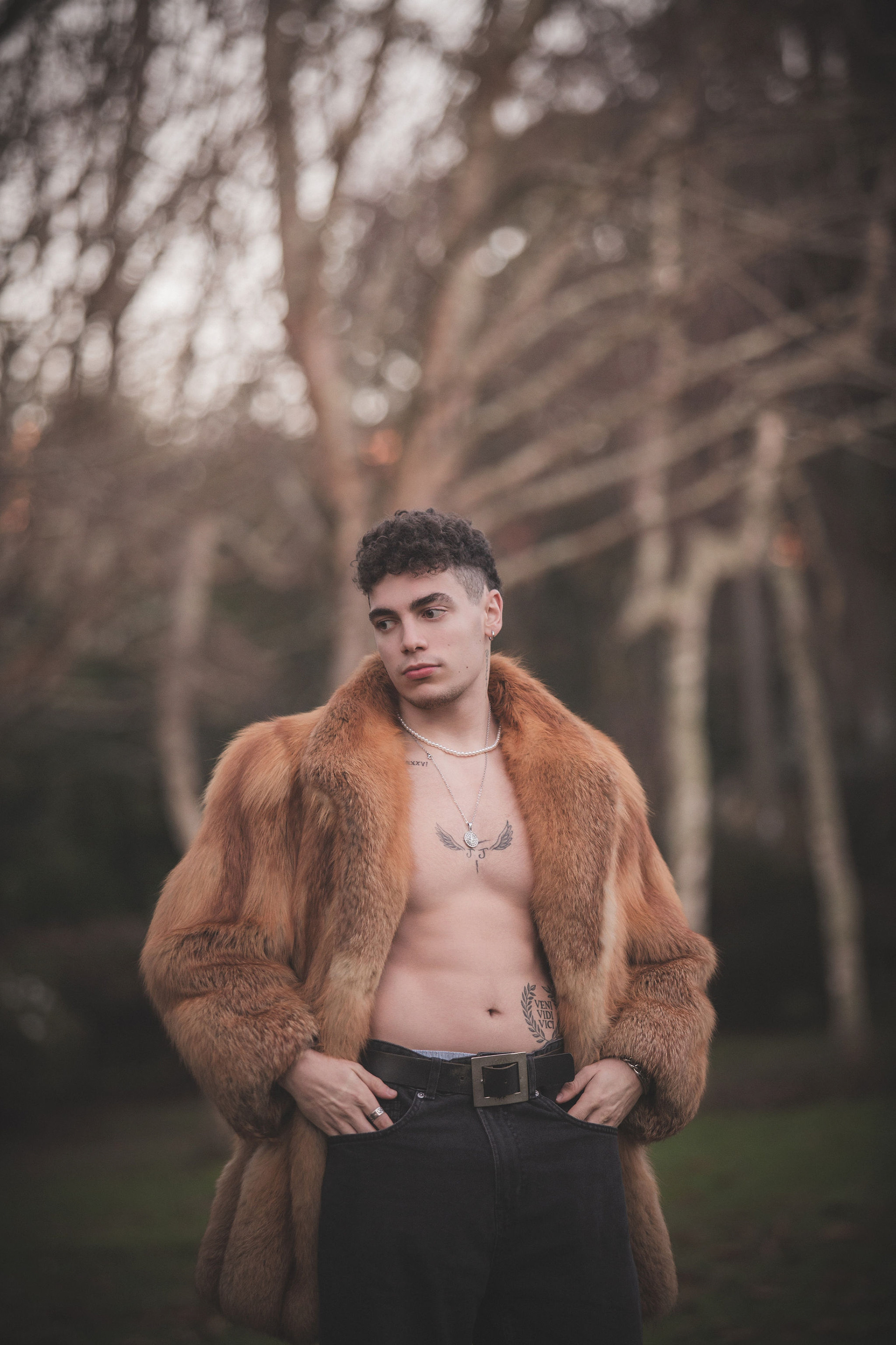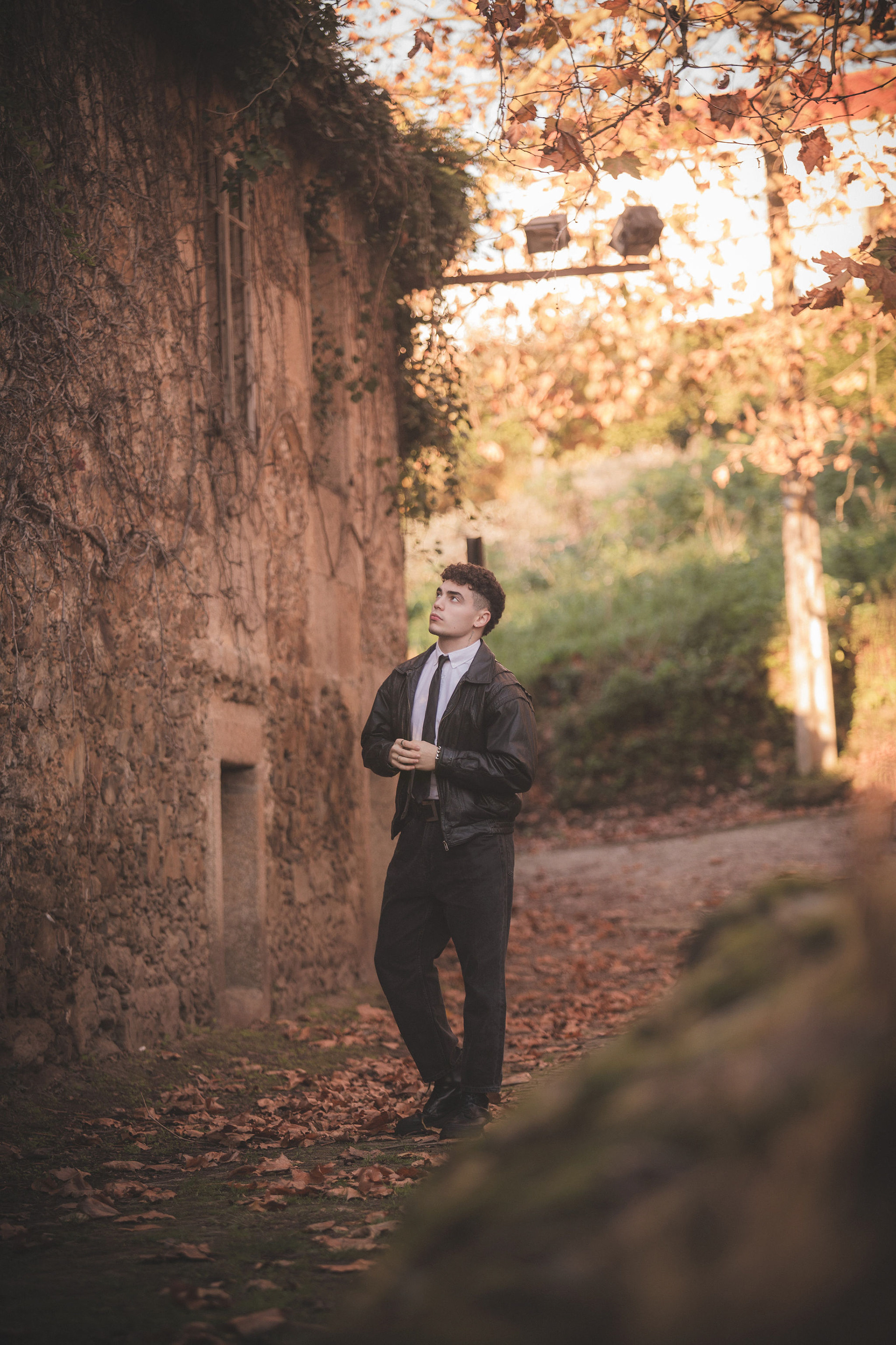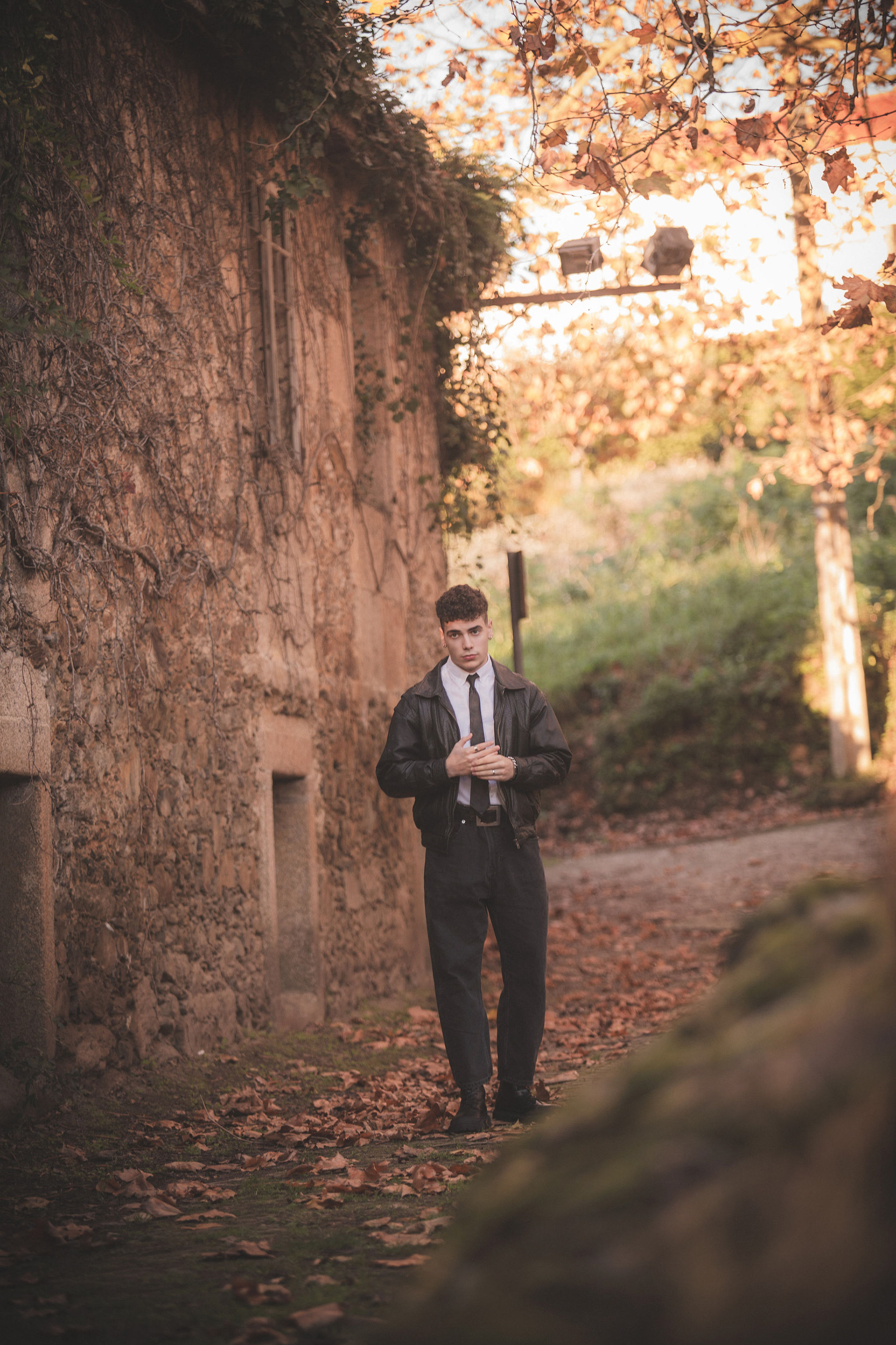 La sesión con Ismael en el parque de Montrove, en Oleiros, fue un homenaje a la paleta dorada y cobriza del otoño. El escenario era un lienzo vivo: una alfombra de hojas crujientes en tonos de ámbar, carmesí y ocre cubría los senderos, mientras la luz tamizada por las ramas de los árboles creaba un ambiente íntimo y mágico. Ismael, con su figura esbelta y juvenil, se movía con una soltura natural, vistiendo una combinación estudiada de clásico y moderno. El icónico abrigo de piel, lanzado con desenfado sobre sus hombros, contrastaba con piezas de corte actual, creando una imagen de una elegancia atemporal que resaltaba su físico sin necesidad de mostrarlo explícitamente.