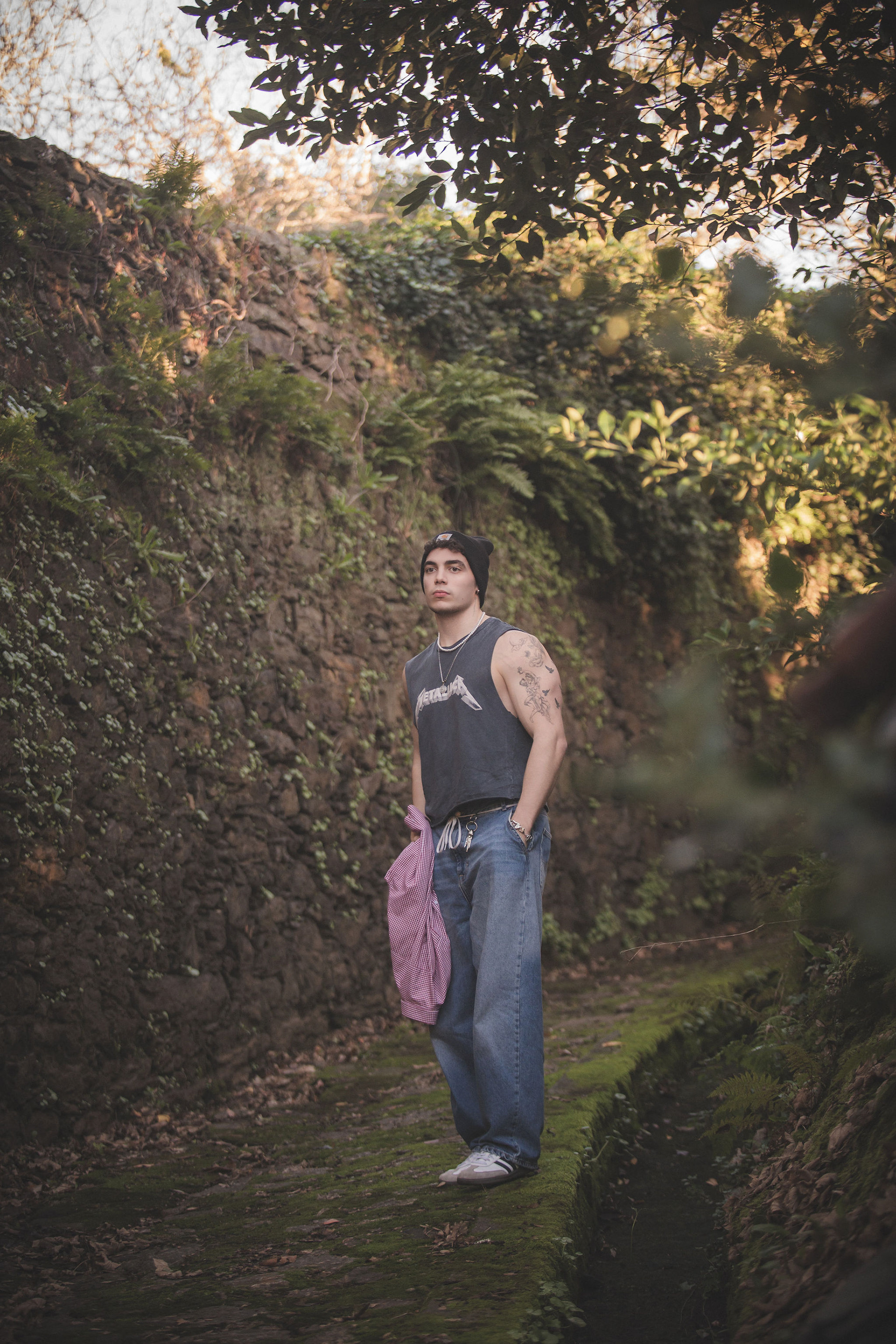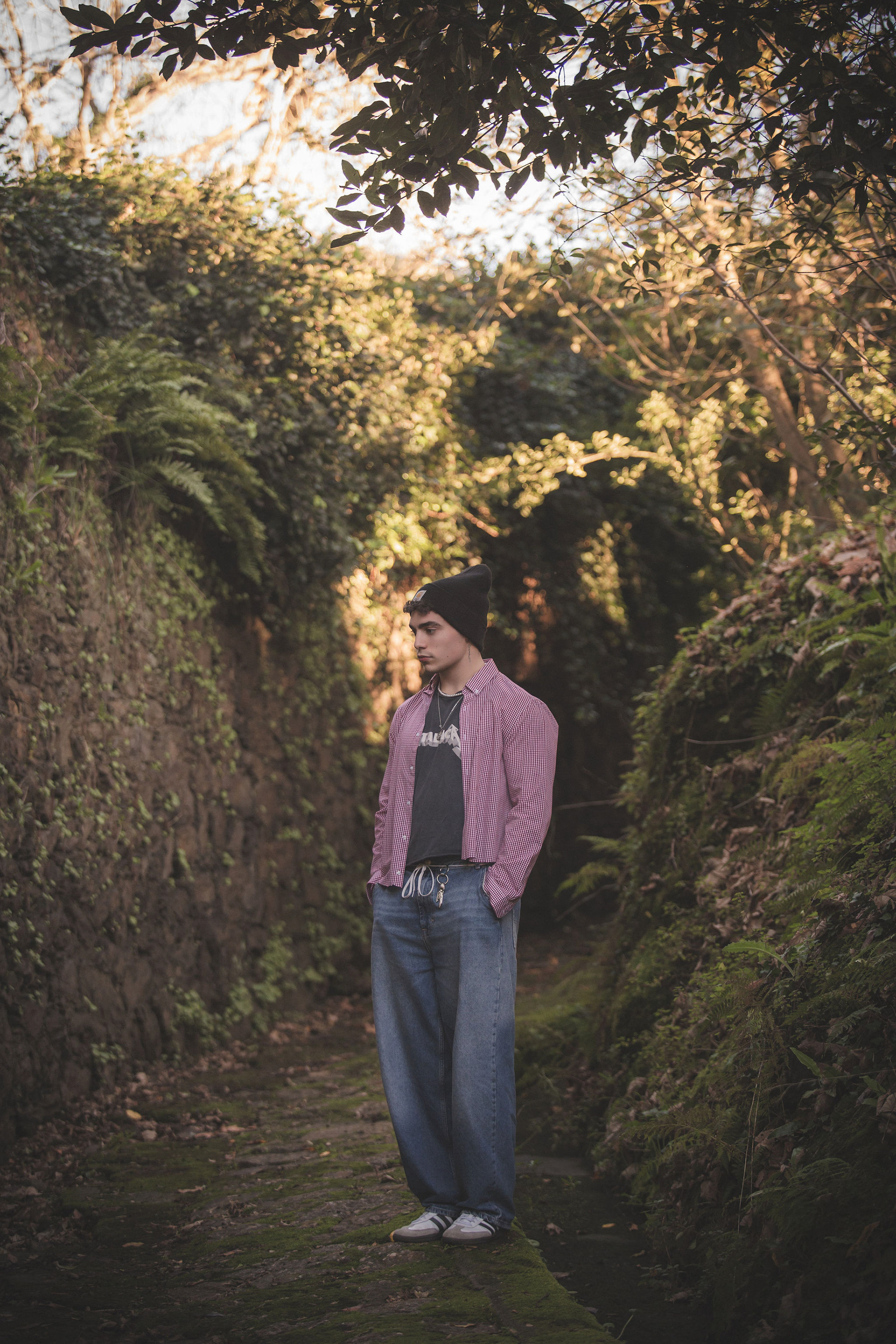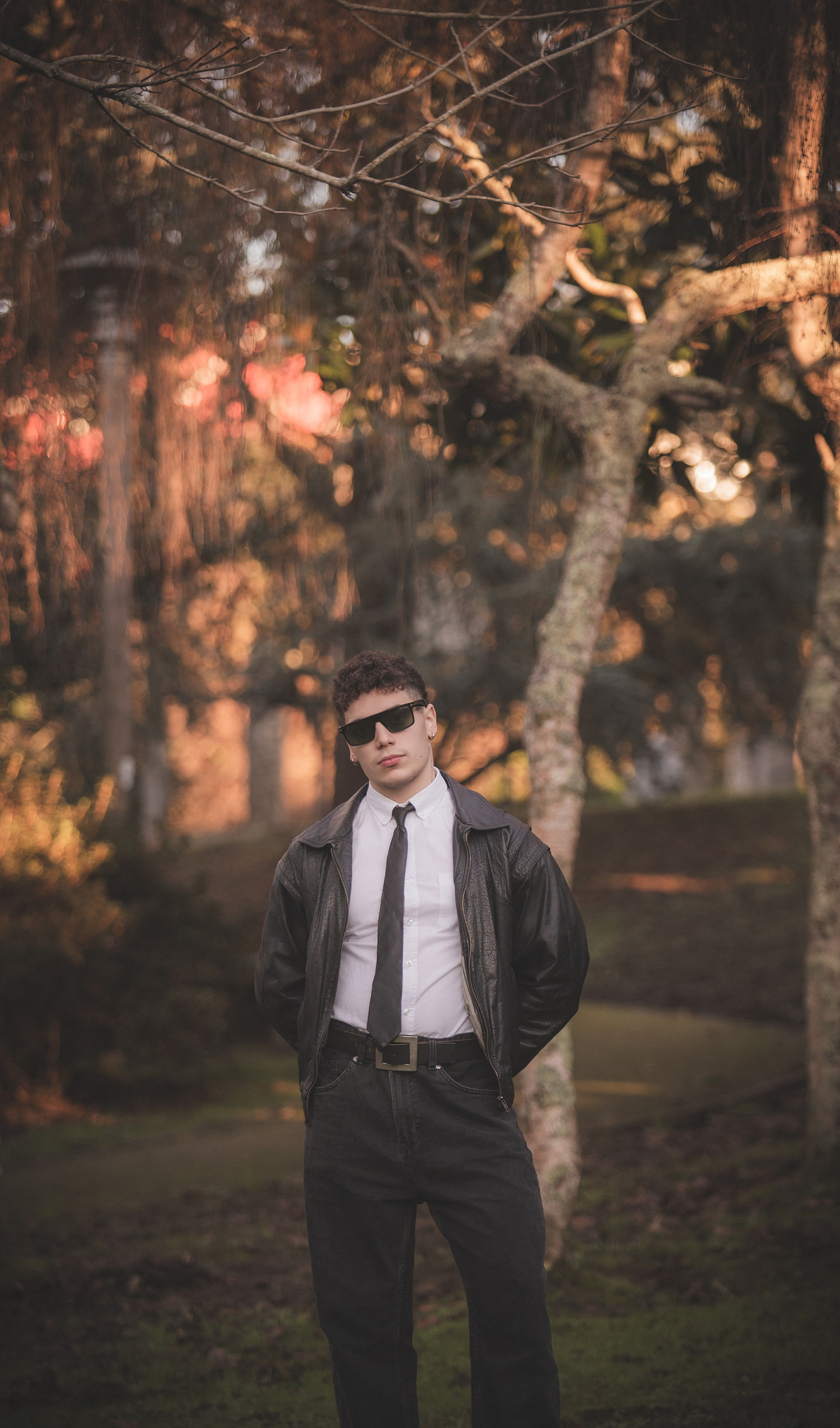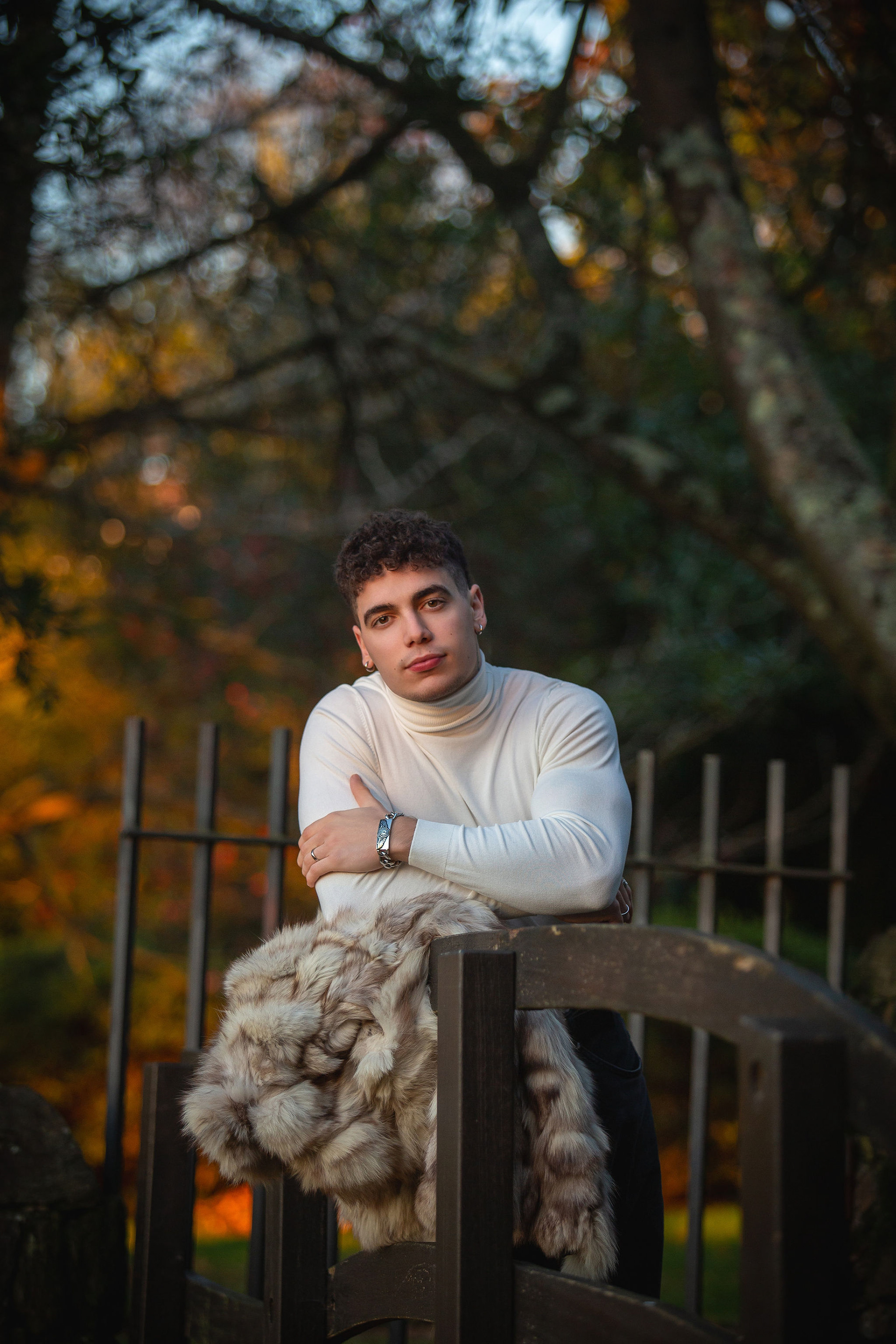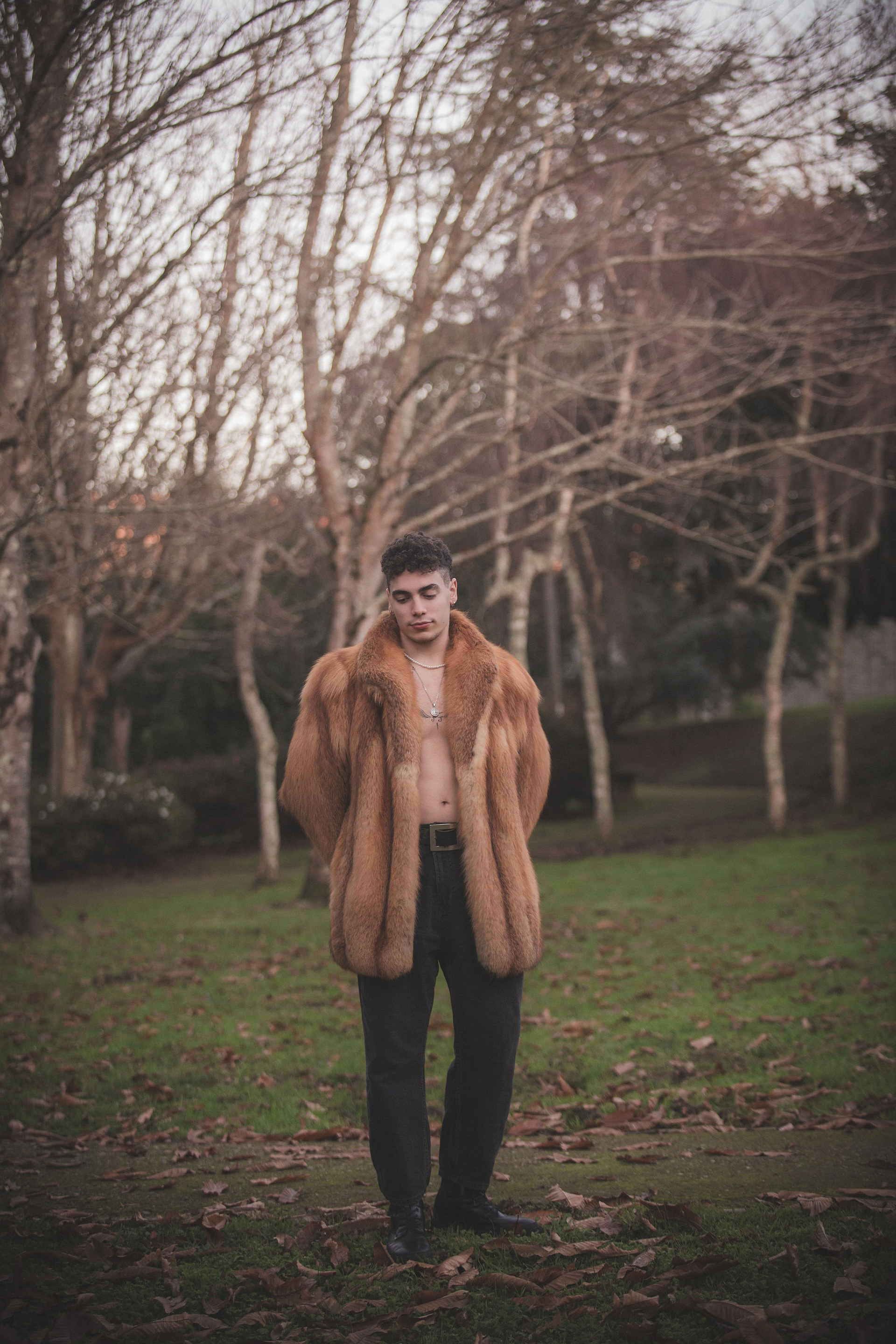 La sesión con Ismael en el parque de Montrove, en Oleiros, fue un homenaje a la paleta dorada y cobriza del otoño. El escenario era un lienzo vivo: una alfombra de hojas crujientes en tonos de ámbar, carmesí y ocre cubría los senderos, mientras la luz tamizada por las ramas de los árboles creaba un ambiente íntimo y mágico. Ismael, con su figura esbelta y juvenil, se movía con una soltura natural, vistiendo una combinación estudiada de clásico y moderno. El icónico abrigo de piel, lanzado con desenfado sobre sus hombros, contrastaba con piezas de corte actual, creando una imagen de una elegancia atemporal que resaltaba su físico sin necesidad de mostrarlo explícitamente.
