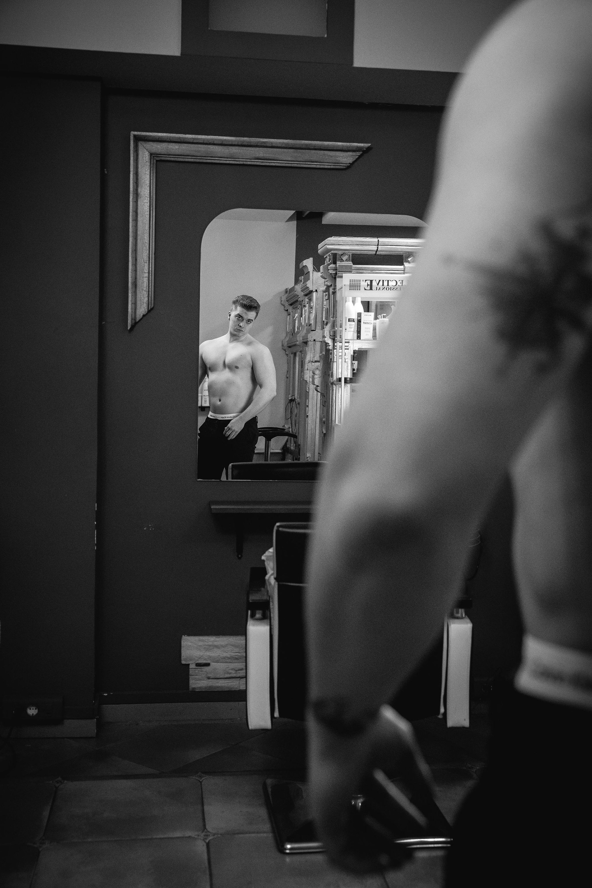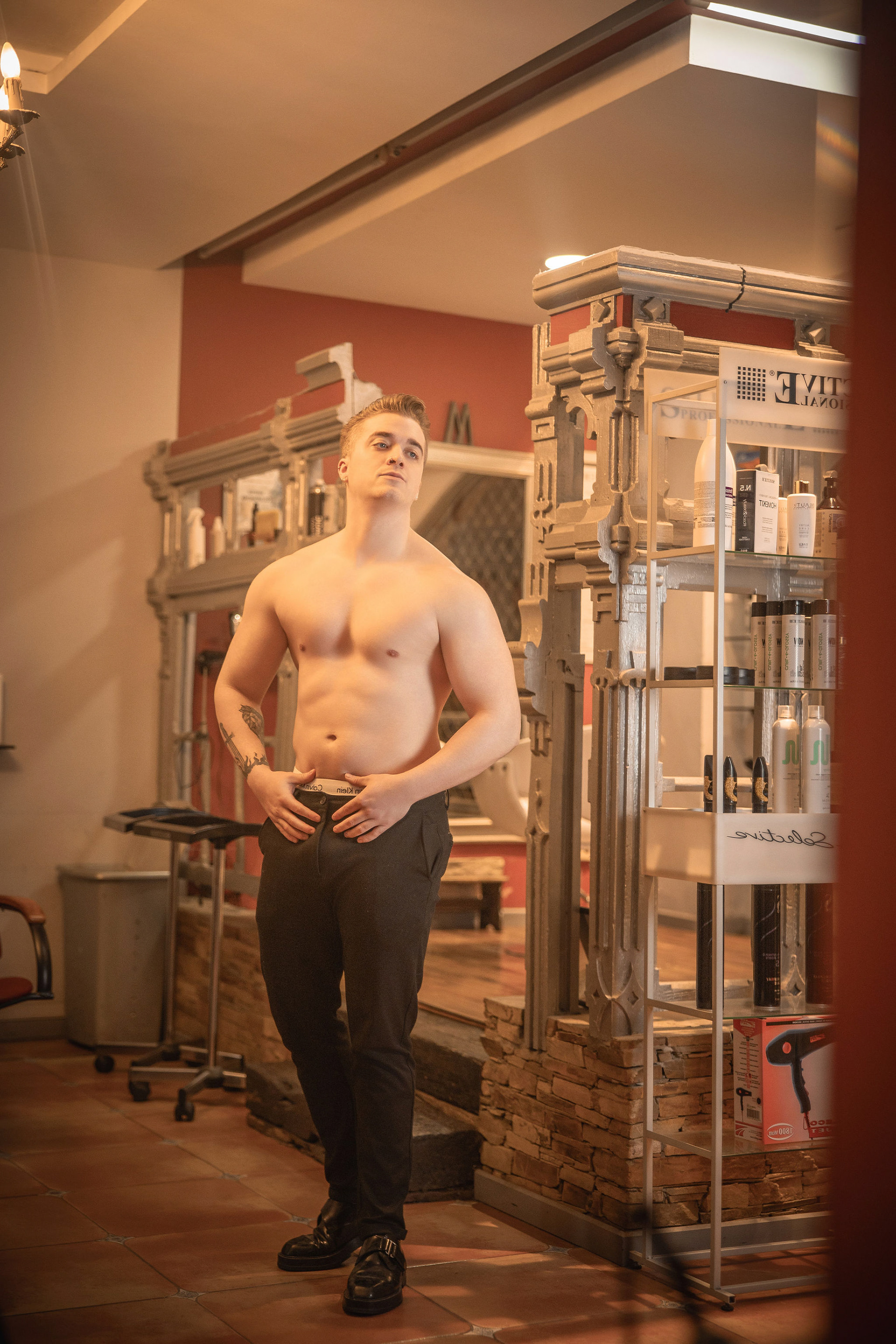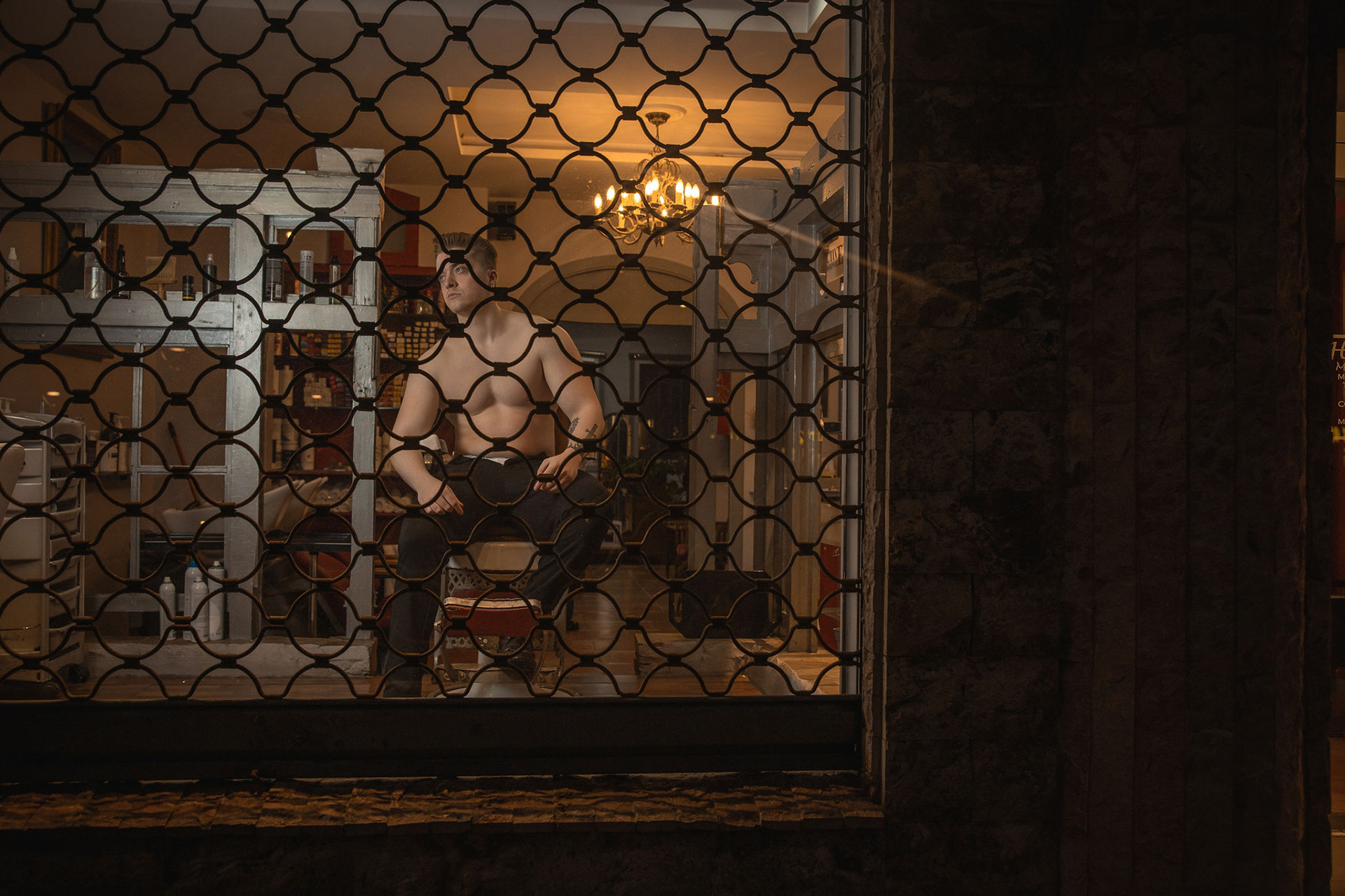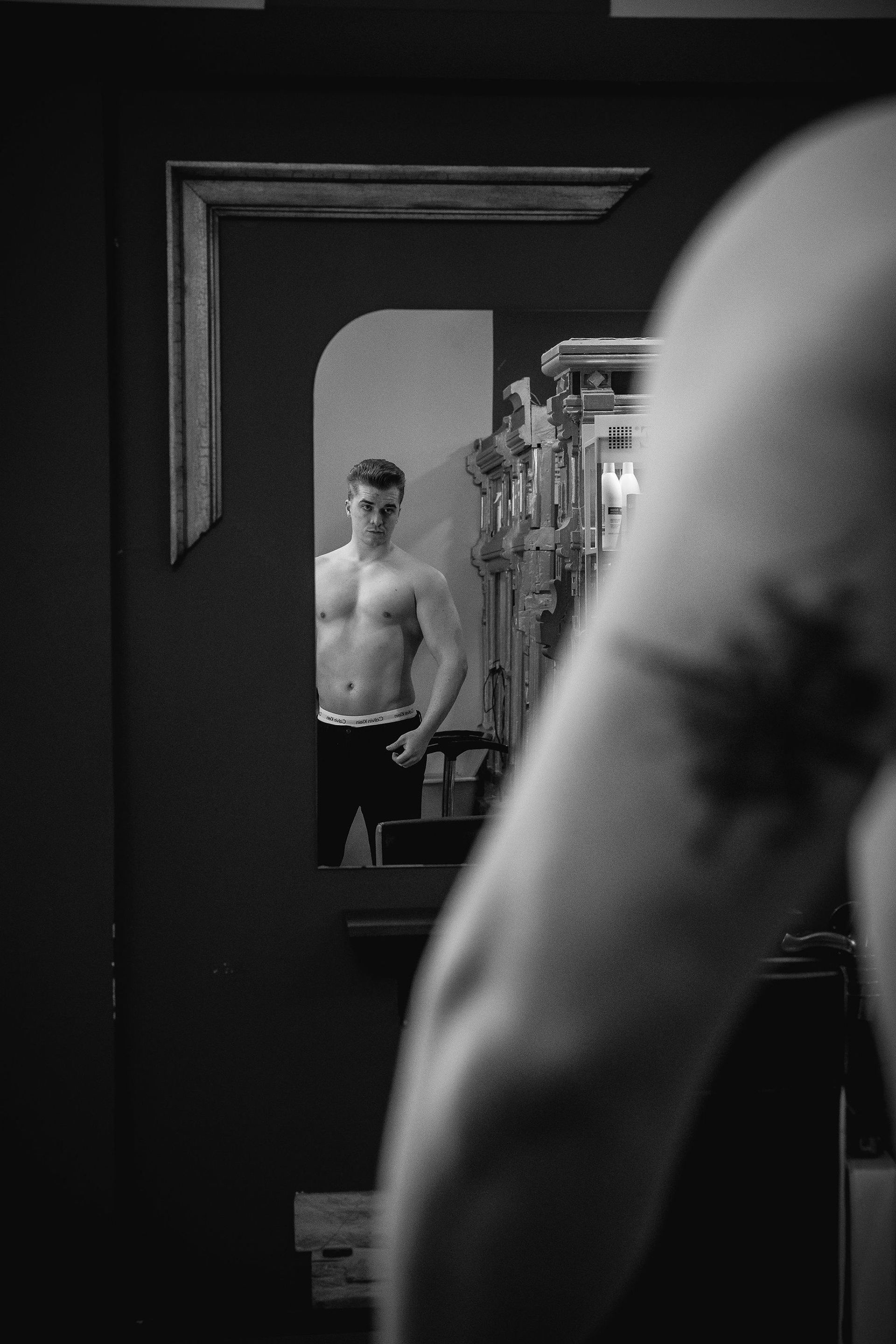 La sesión se desarrolló en el interior de un local comercial de A Coruña, cuyos ventanales bañaban el espacio con una luz diurna suave y difusa. El objetivo era claro: esculpir con la luz la atlética figura de Joel, un modelo joven. Los reflectores de luz continua se posicionaron estratégicamente para crear un juego de claroscuros, realzando la definición de su torso y sus hombros. Cada haz de luz no solo iluminaba, sino que acariciaba sus músculos, creando volúmenes y profundidad, y transformando su cuerpo en el elemento arquitectónico principal del escenario urbano y minimalista que ofrecía el local.