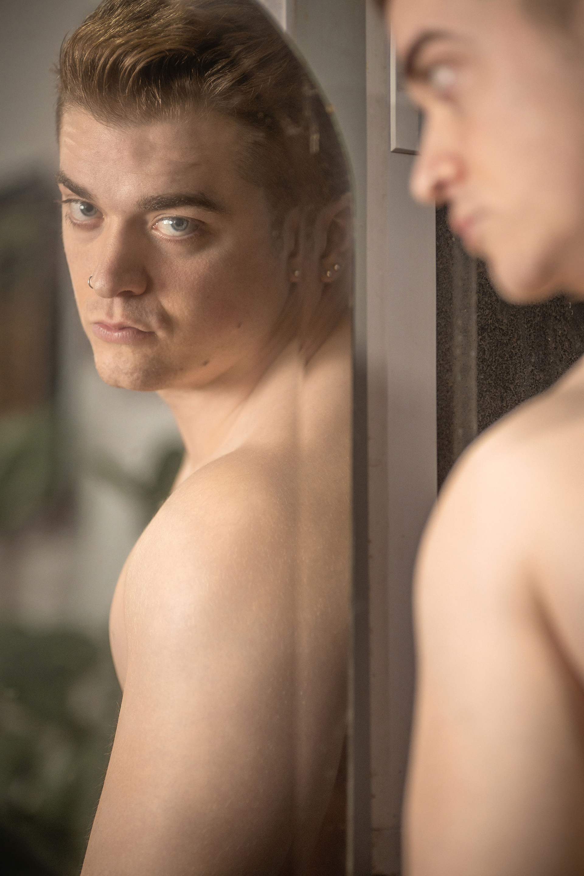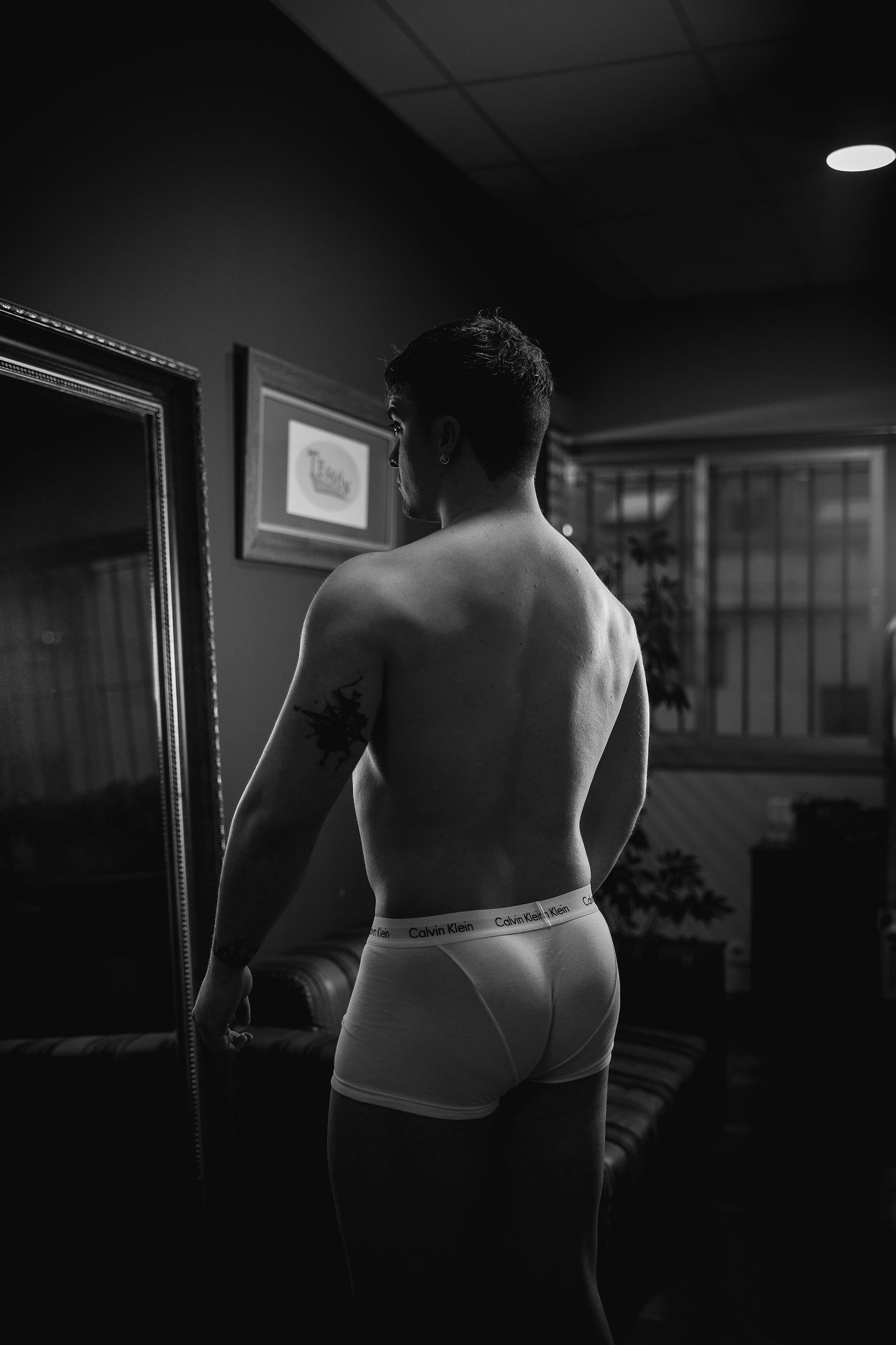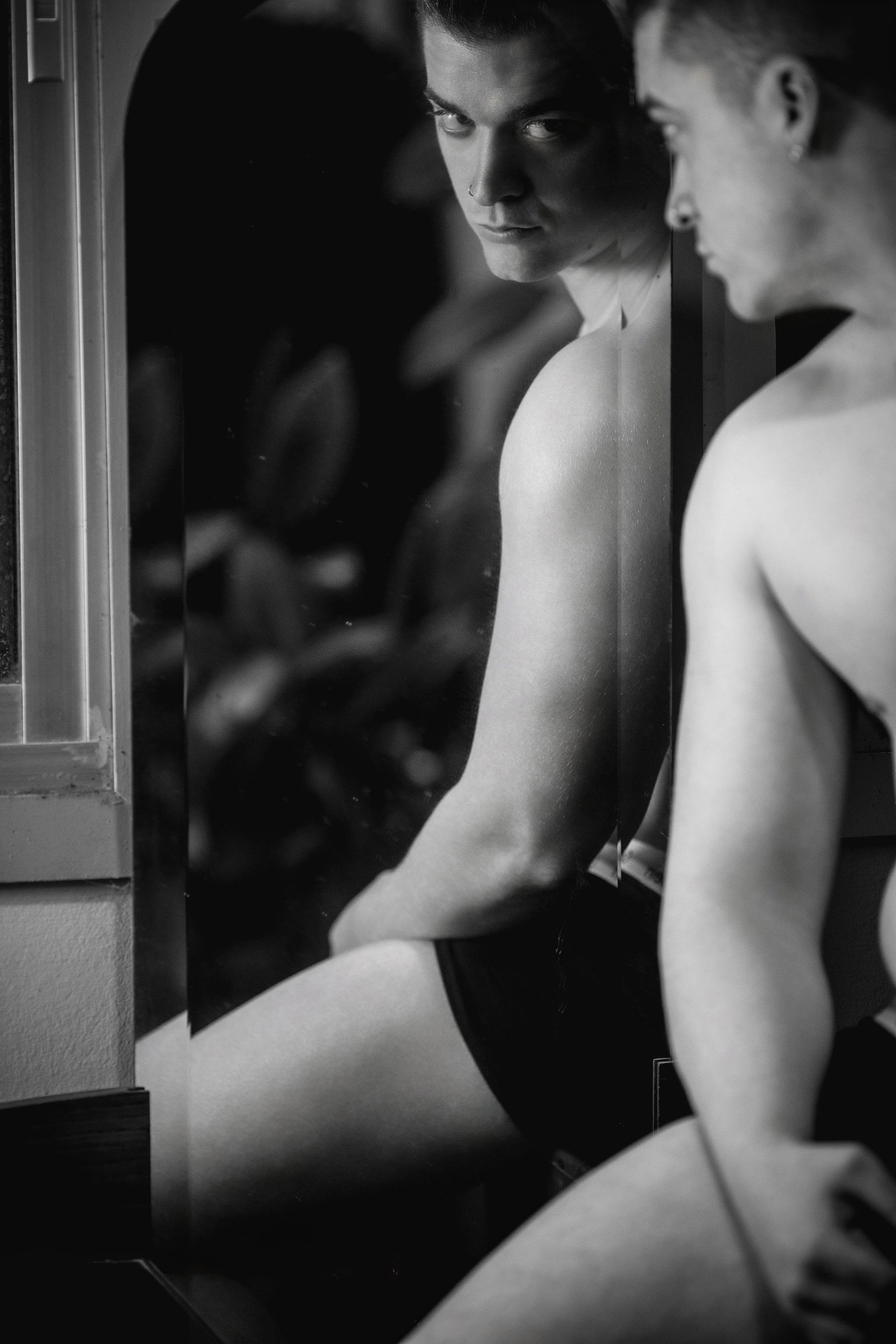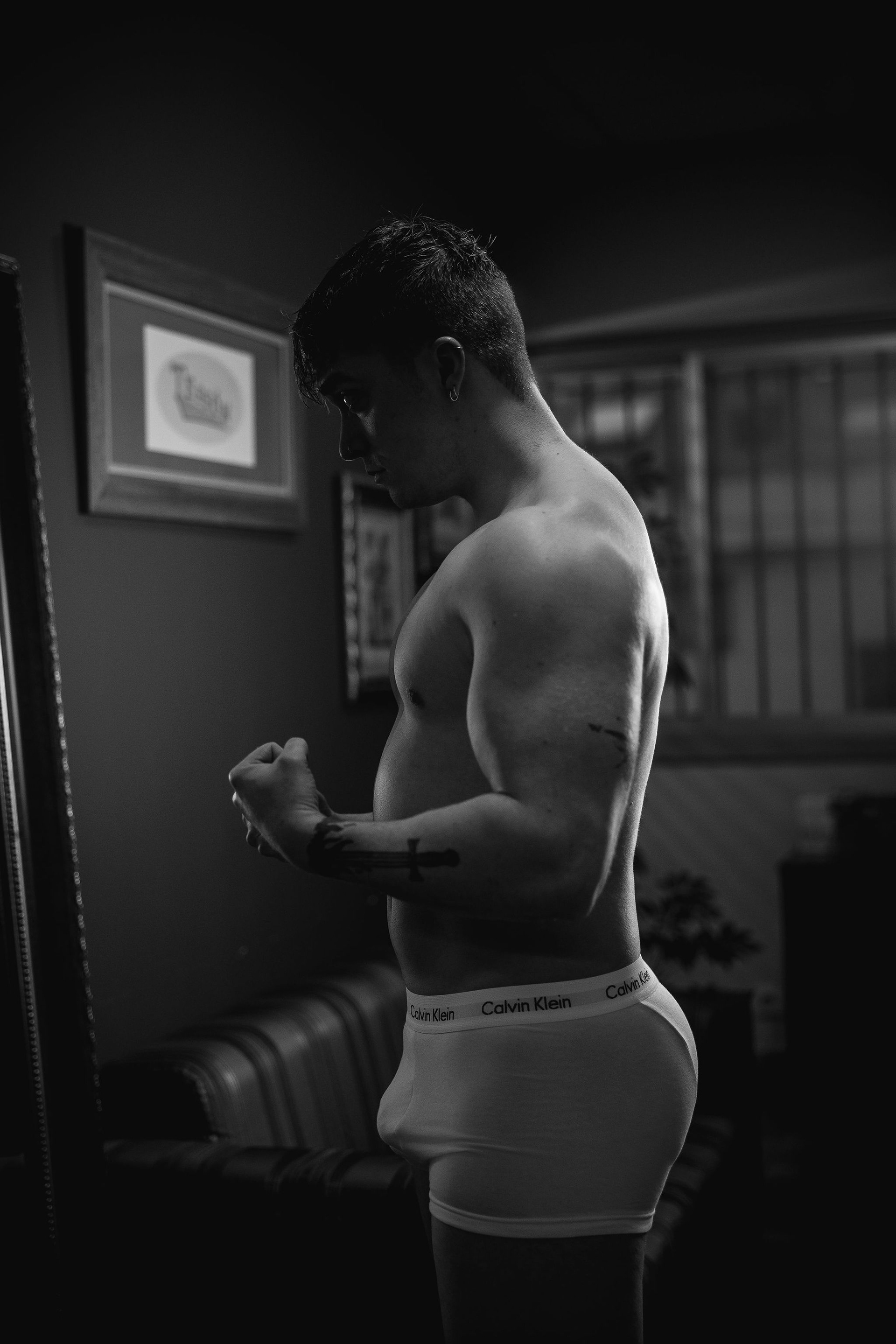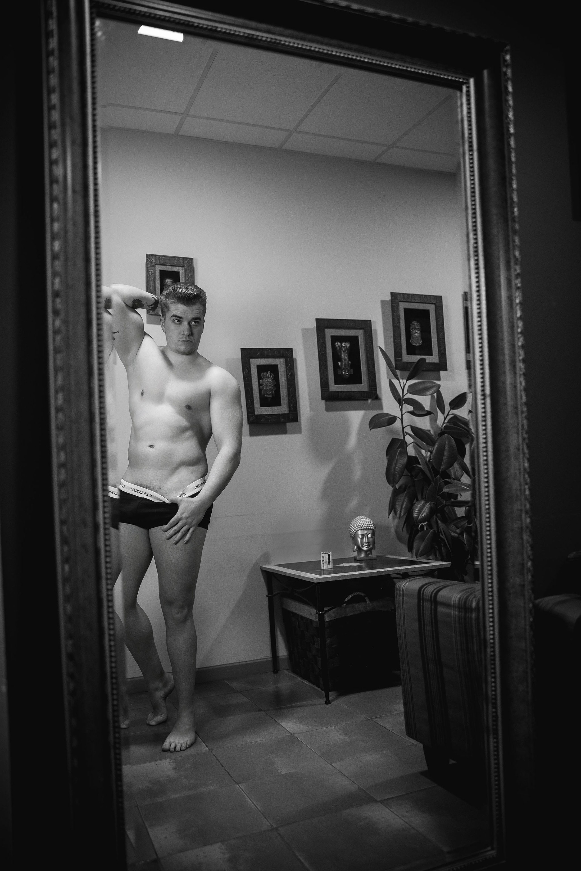 La sesión se desarrolló en el interior de un local comercial de A Coruña, cuyos ventanales bañaban el espacio con una luz diurna suave y difusa. El objetivo era claro: esculpir con la luz la atlética figura de Joel, un modelo joven. Los reflectores de luz continua se posicionaron estratégicamente para crear un juego de claroscuros, realzando la definición de su torso y sus hombros. Cada haz de luz no solo iluminaba, sino que acariciaba sus músculos, creando volúmenes y profundidad, y transformando su cuerpo en el elemento arquitectónico principal del escenario urbano y minimalista que ofrecía el local.
