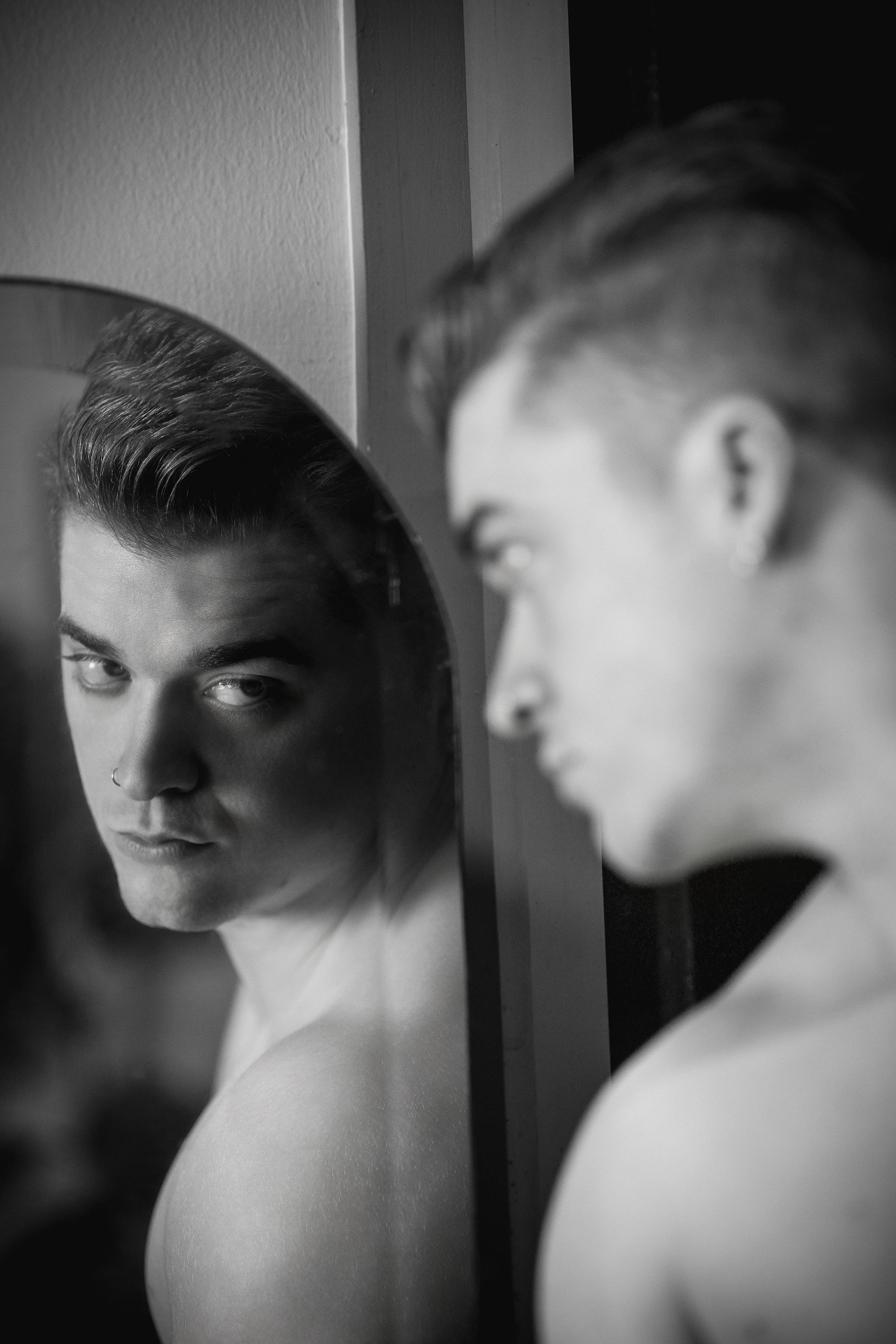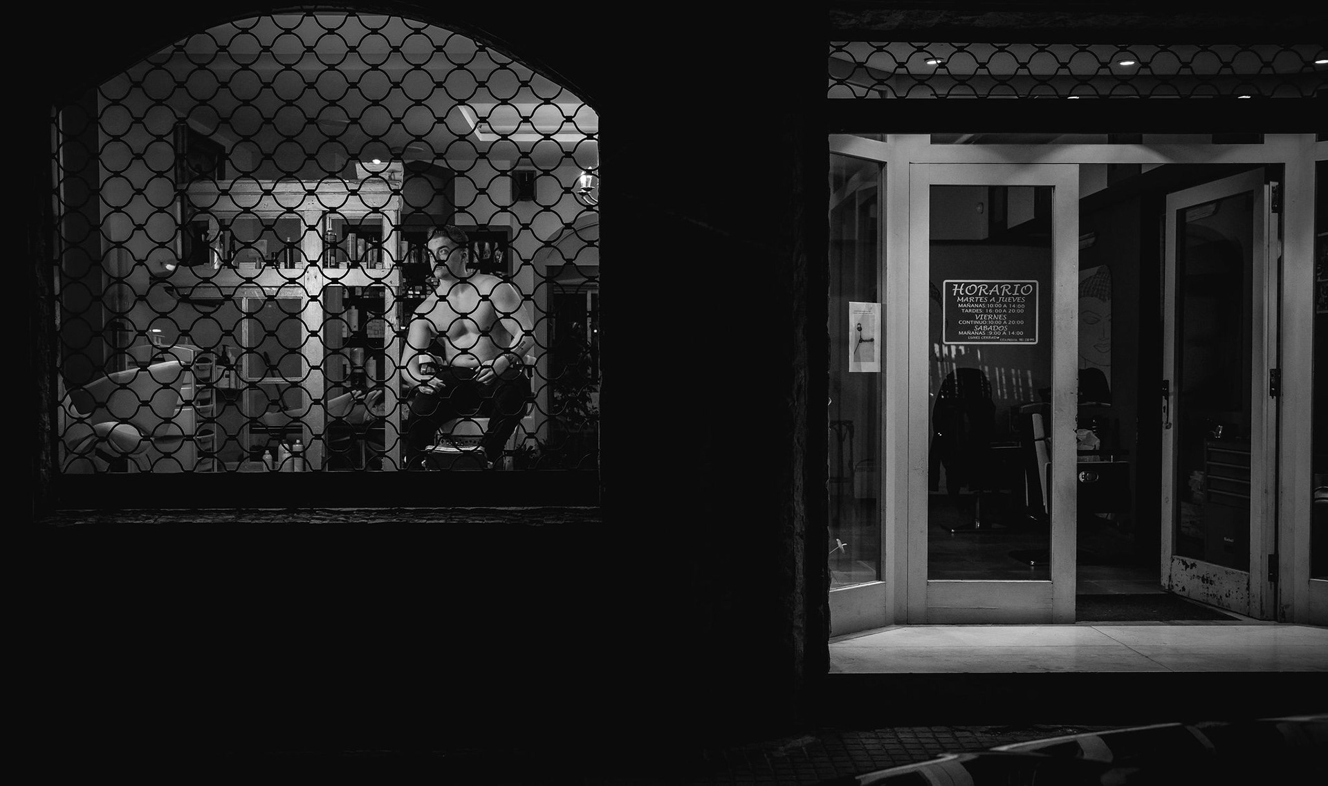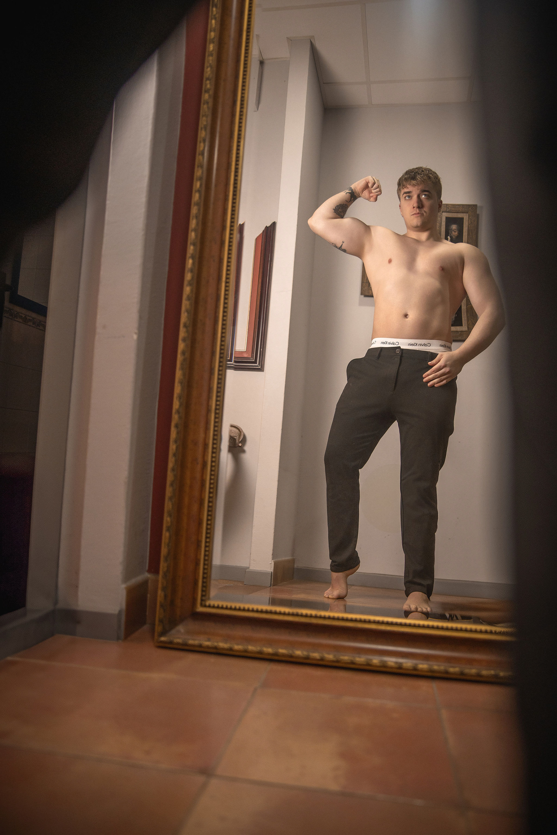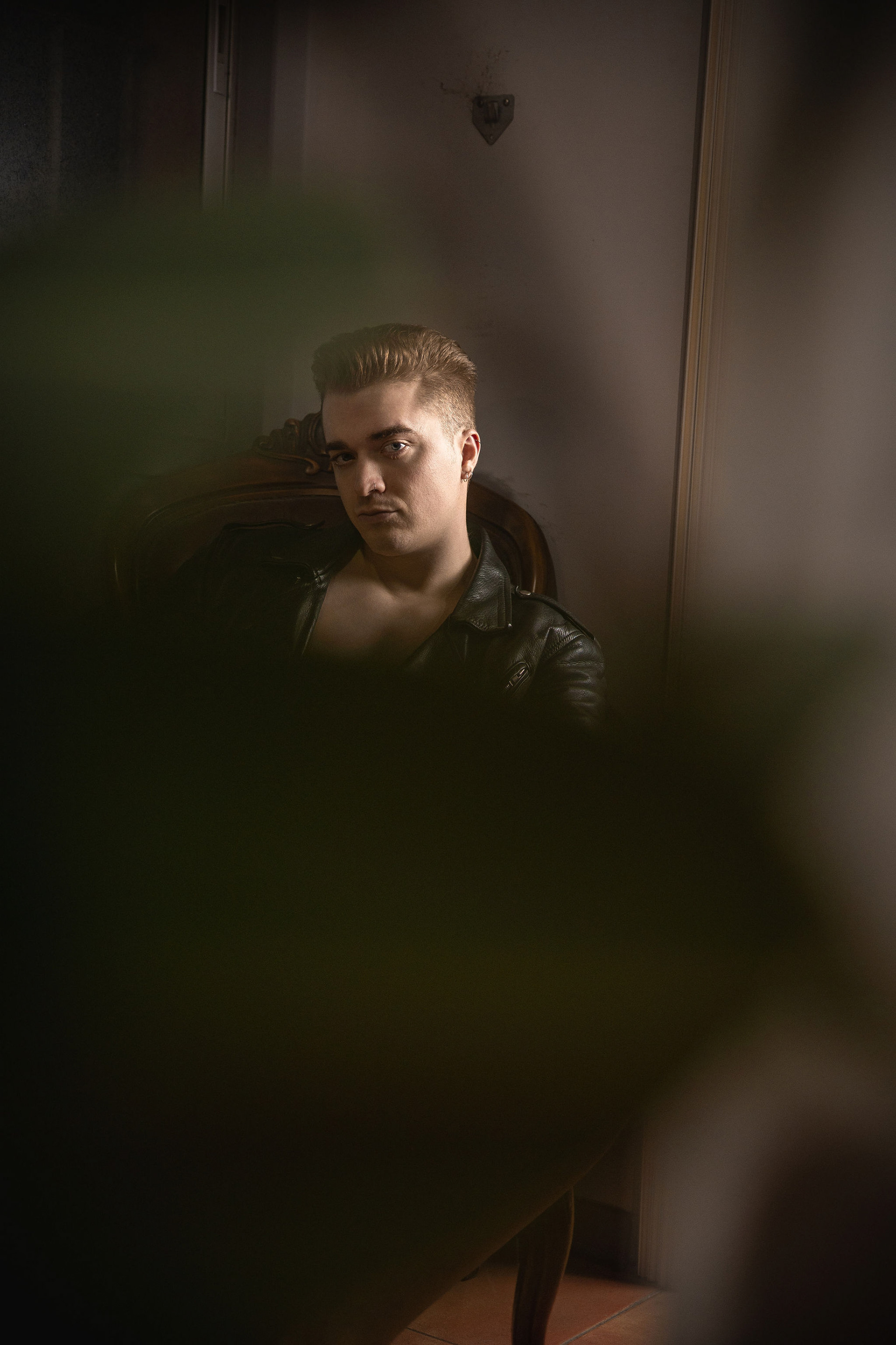 La sesión se desarrolló en el interior de un local comercial de A Coruña, cuyos ventanales bañaban el espacio con una luz diurna suave y difusa. El objetivo era claro: esculpir con la luz la atlética figura de Joel, un modelo joven. Los reflectores de luz continua se posicionaron estratégicamente para crear un juego de claroscuros, realzando la definición de su torso y sus hombros. Cada haz de luz no solo iluminaba, sino que acariciaba sus músculos, creando volúmenes y profundidad, y transformando su cuerpo en el elemento arquitectónico principal del escenario urbano y minimalista que ofrecía el local.