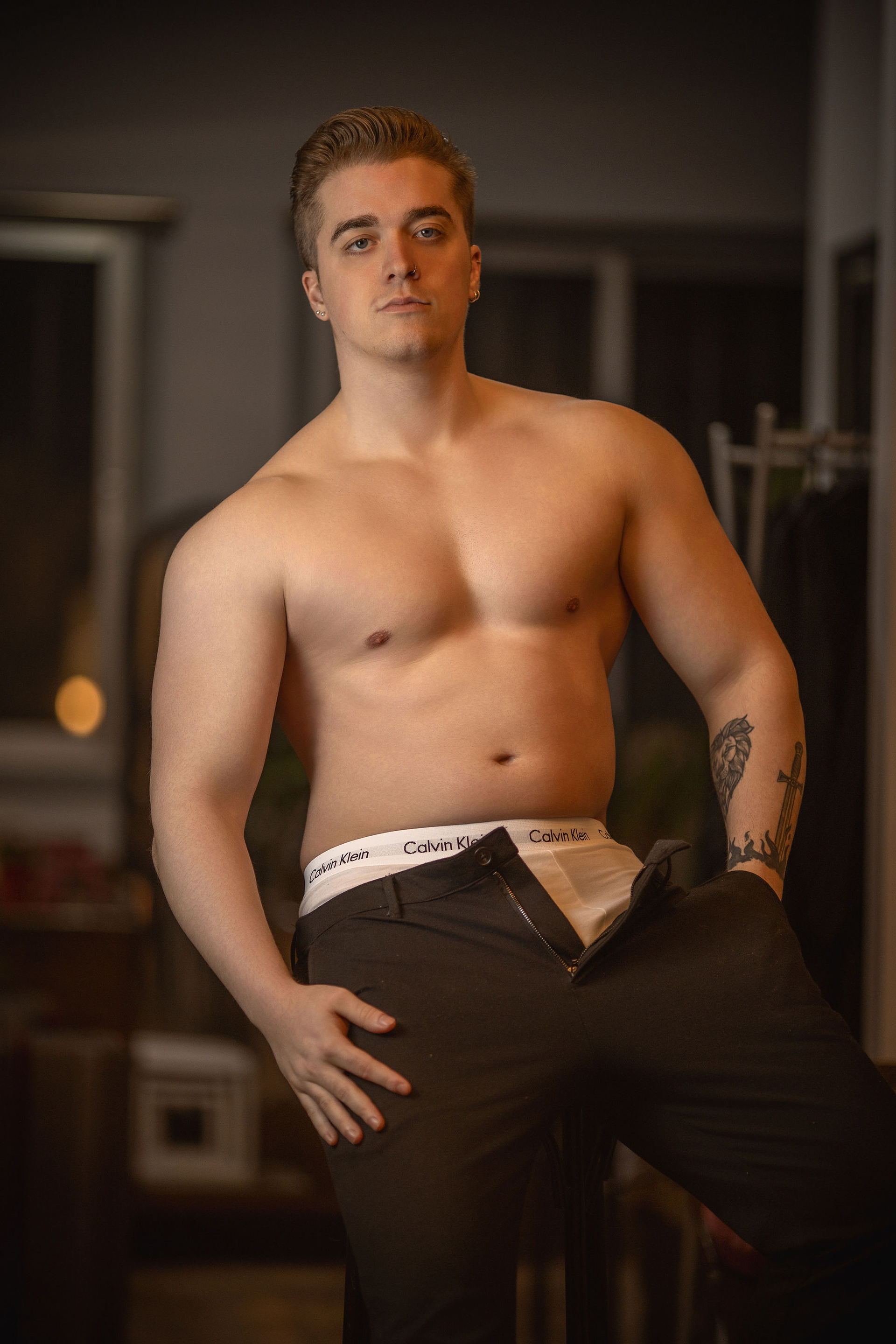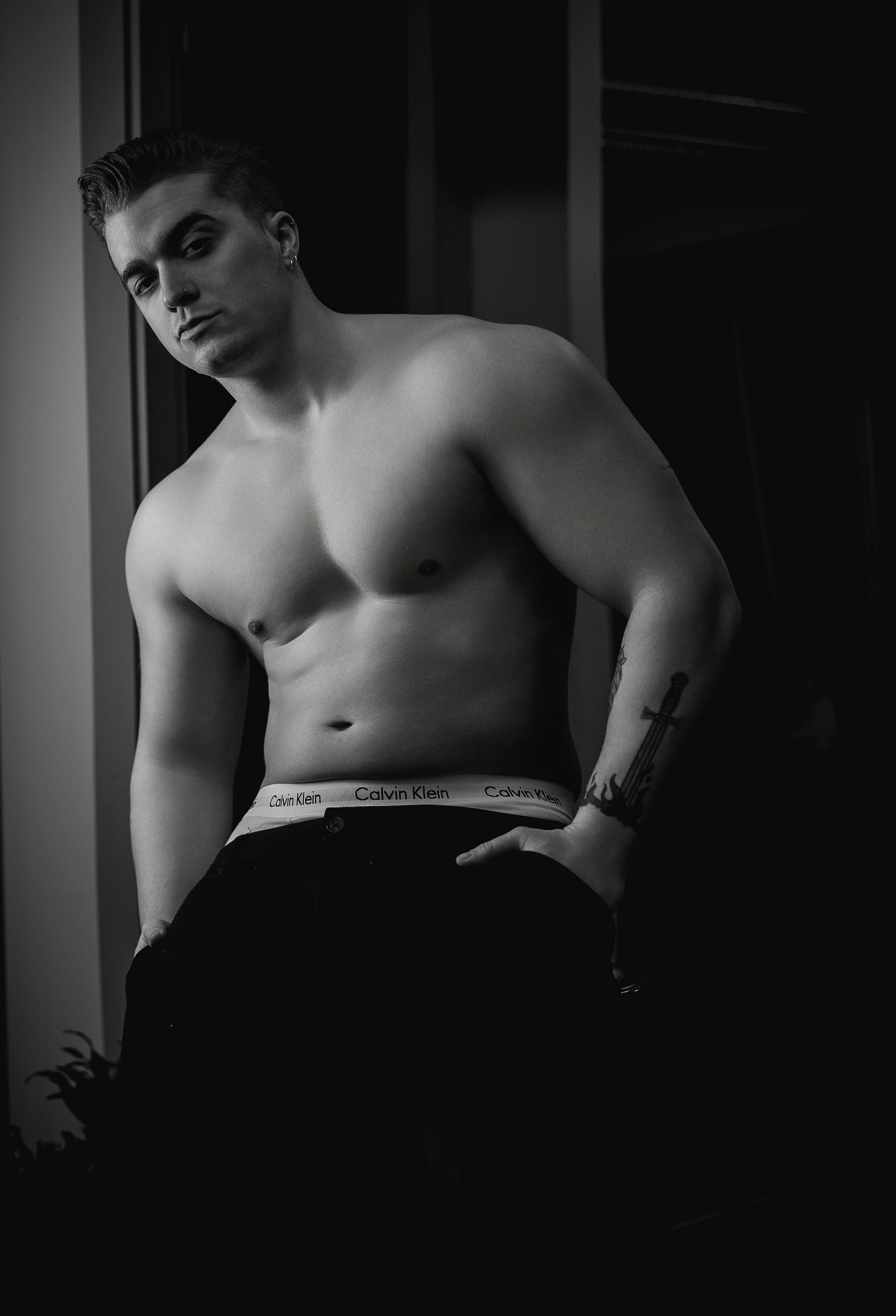 El ambiente era de concentrada profesionalidad. Bajo la atenta dirección del fotógrafo, Joel se movía con naturalidad entre las islas de luz, adoptando poses que, lejos de ser forzadas, transmitían una serena potencia. El resultado fue una serie de imágenes donde la textura de la piel, el juego de sombras y la expresión segura del modelo se fusionaban, logrando una estética sofisticada que equilibraba la fuerza con una elegante intimidad.